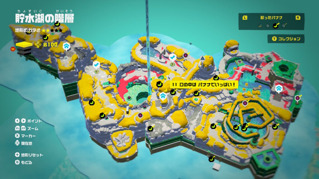 収集要素であるバナナや化石は数が膨大で集めるのが大変ですが、それぞれの地図を入手することで全てマップに記されるため、見逃すということが起きません(取得済みのものも分かるようになってます)。