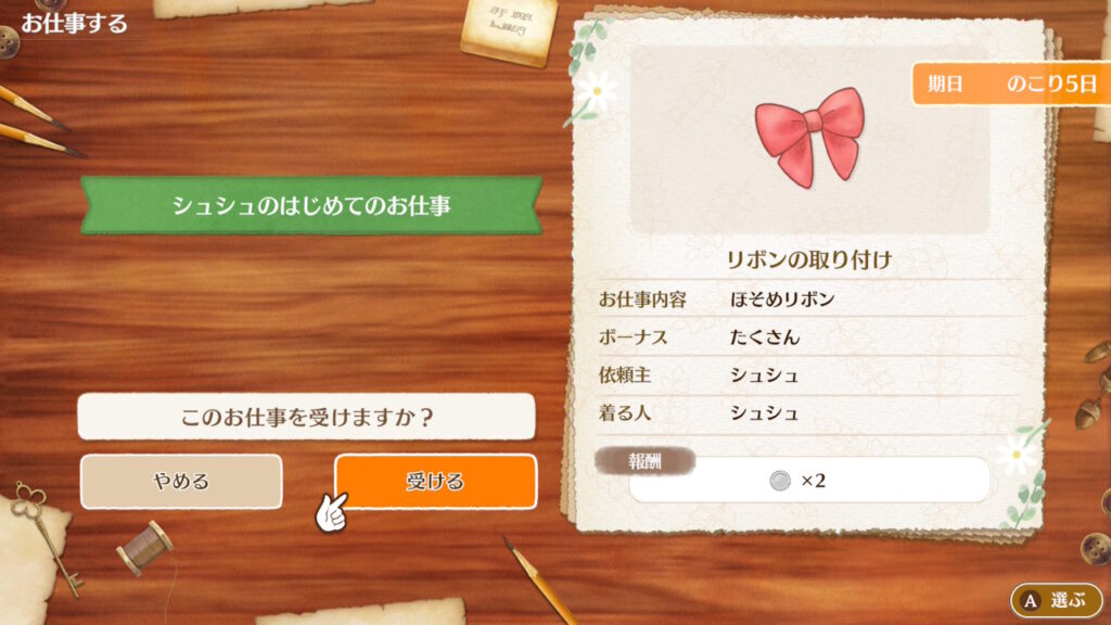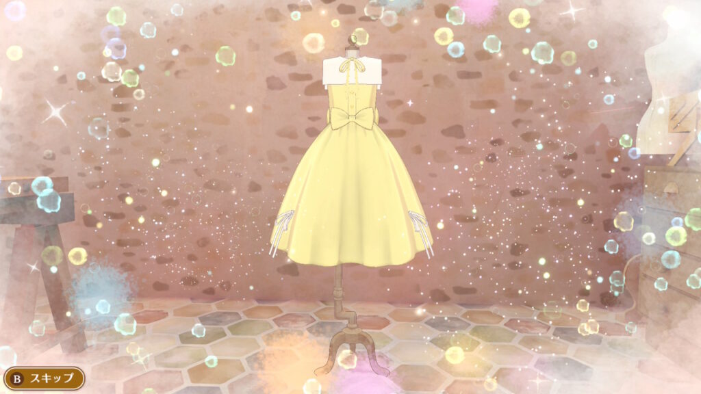 デザイン等を決めたあとはちょっとしたミニゲームをこなす必要があるんだけど、今のところはかなり簡単でミスすることはなさそう。複雑なドレスを作るときとか、もっと難しくなったりするんだろうか。
